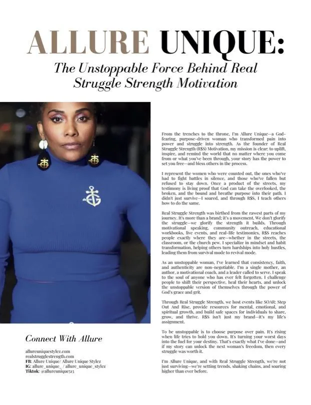 A movement and method created by Allure Unique that empowers people to transform hardships into purpose. It includes books, courses, motivational events, and messages designed to inspire healing, growth, and faith.